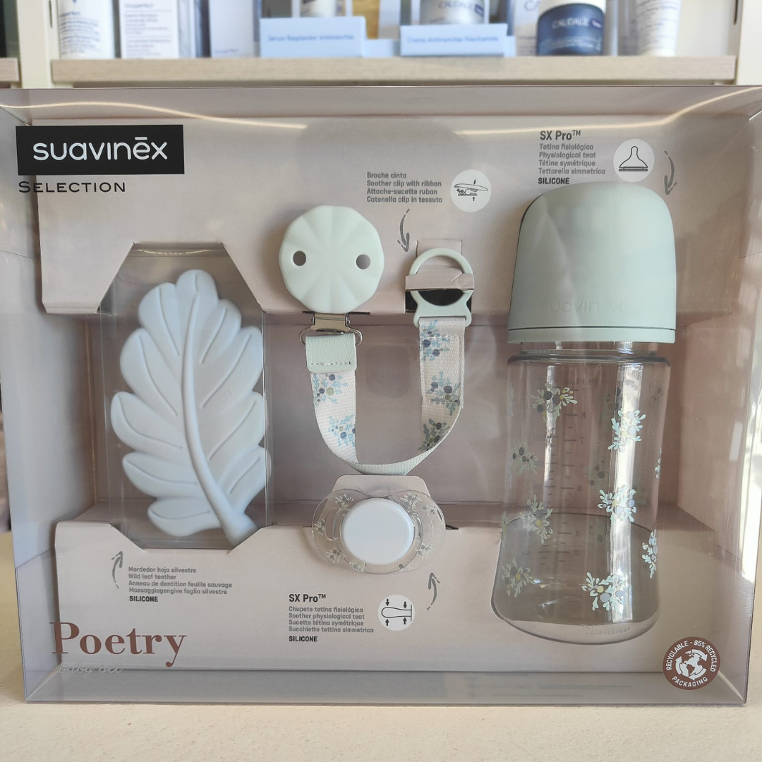 Set Regalo Suavinex Poetry (0-6 Meses) – Incluye Mordedor de Silicona, Chupete, Broche Cinta y Biberón de 270 ml | Edición Especial Bebé